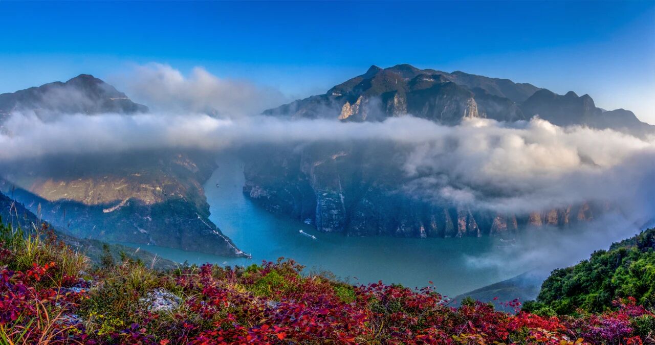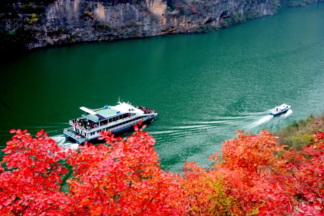 一江碧水,万山红遍 目前巫山红叶渐次“绽放”巫峡两岸层林尽染山顶红叶如燎原烈火与江水映衬勾勒出一幅波澜壮阔的天然画卷