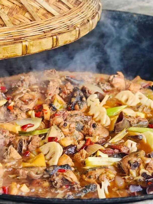 在炊烟袅袅的灶台旁,一锅热气腾腾的柴火鸡正散发着诱人的香气,那是烟火气中最质朴、最动人的美食诗篇。 农家跑山土鸡与十多种配菜在柴火的热烈拥抱下,慢慢炖煮,每一口都是对食材原味的极致追求。 清栖谷漫溪林舍野炊柴火鸡味道惊艳,软糯又很筋道,越吃越香;肉质入口化渣,辣而不燥,鲜嫩爽口,暖身暖胃令人回味无穷,那种飘香的香味让人又回到儿时的记忆中。 精心捏制的玉米饼,软糯香甜,揉捏成型之后贴在锅的周围,仅靠锅中的蒸汽就能焖熟。金黄的玉米饼外酥里嫩,天然的香气与鸡肉香融合得浑然一体,蘸着柴火鸡的汤汁来吃又香又脆,配上一碗柴火箜饭,每一口都是回味。