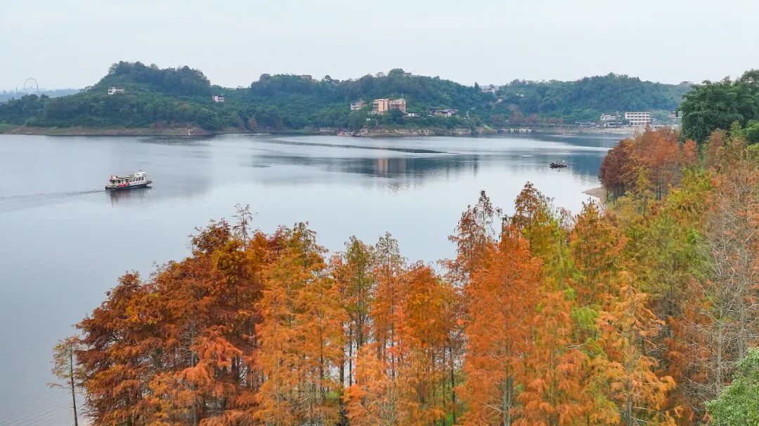 冬意悄然爬上枝头长寿湖的水杉林 正上演一场盛大的色彩魔术 ——绿、黄、红 层林尽染 倒映在粼粼波光间 宛若打翻的调色盘