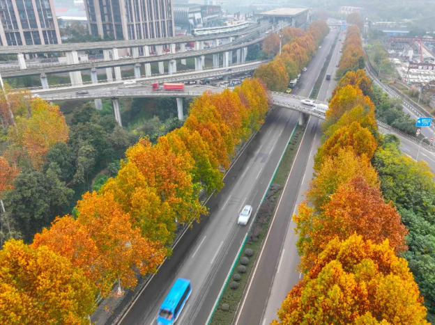 走在龙洲大道、渝南大道 箭河路、南温泉景区…… 你会邂逅一场不期而然的视觉盛宴 道路两旁 梧桐换上了冬日的新装 金黄、赭红、暖棕交织 像是被阳光吻过的调色盘 静静铺展在城市的脉络里