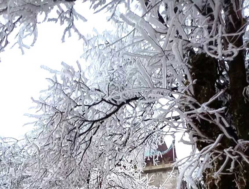 壮阔山坳气势雄伟 几公里公路全是雾凇 不过冻雨会导致上山的路结冰 给车辆出行带来不便 所以建议大家最好徒步上山