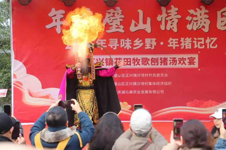 11时许,年味璧山情满园“寻味乡野 年猪记忆”年货消费季正兴花田牧歌刨猪文化盛宴开幕。随后舞蹈《好运全都来》、女声独唱《这不是遥远的地方》、川剧变脸与吐火表演等节目轮番上阵将现场氛围一次次推向高潮。