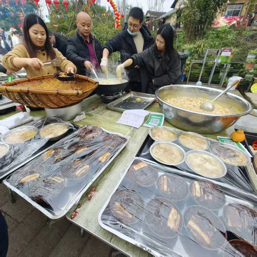 除了开幕式和文艺演出,当天的活动还设置了多项全天打卡项目。写春联、剪窗花、糊灯笼等非遗体验吸引了众多亲子家庭参与;乡村年货集市上,炸酥肉、卤猪蹄、腊肉香肠、烤排骨等特色小吃香气四溢,农家蔬菜、野葛根粉、红薯粉、蜂蜜、土鸡土鸭等土货深受游客青睐。正兴蜜柚,脐橙,蜂蜜等当地特色农产品也让人垂涎欲滴。