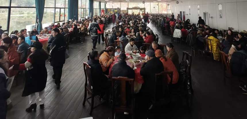 午间,水上餐厅里飘出阵阵香味,刨猪午宴开席。游客们围坐一堂,品尝地道的刨猪汤和农家菜肴,欢声笑语不断。