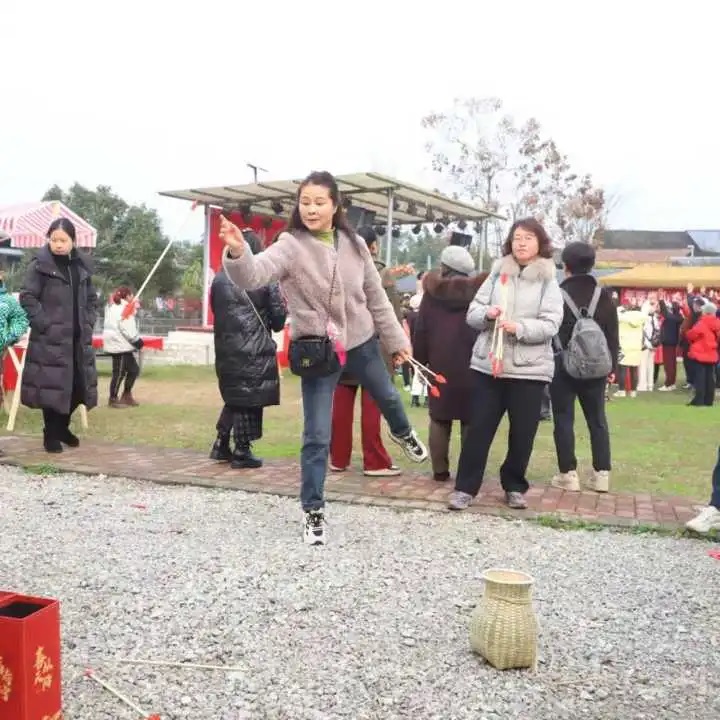 “打糍粑”体验区里,游客们在工作人员指导下捶打糍粑,体验传统年俗;投壶区更是排起了长队,大人小孩争相一试身手。