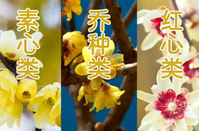 依据花色,可以将众多的蜡梅品种分为三个品种群:素心蜡梅品种群、乔种蜡梅品种群、红心蜡梅品种群。