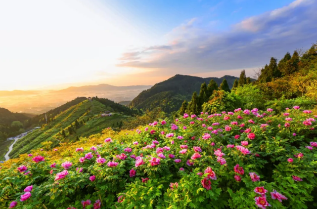 Day2:县城→牡丹樱花世界(粉樱缀径)→明月山毕桥农耕廉韵乡愁园(体验农耕)→垫江芍药产业园(芍药初绽)→宝鼎山杜鹃花(山间缀红)