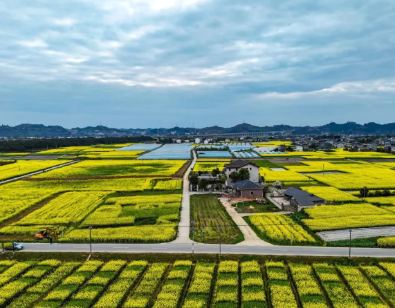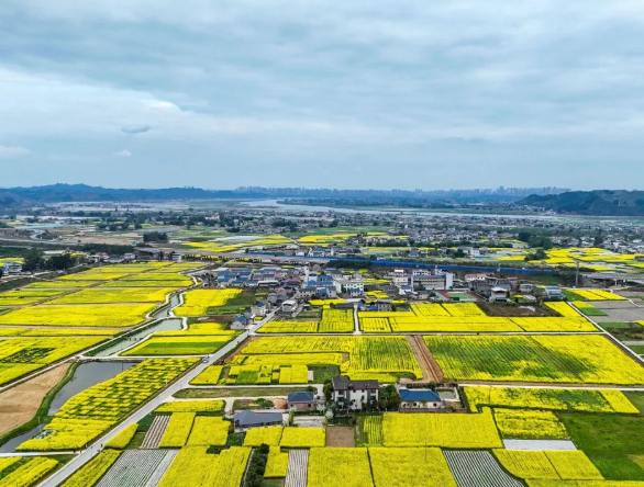 从潼南城区出发,沿着滨江路往三块石电站方向行驶,不过20分钟车程,车窗外的风景就从城市楼宇切换成了连片的金黄。当无人机缓缓升空,眼前的景象更是让人瞬间失语:千亩油菜花顺着田埂铺展,像被春风熨平的金色绒毯,与碧绿的蔬菜基地、澄澈的水塘、白墙黛瓦的农舍交错成画,远处是蜿蜒的潼南运河与连绵的丘陵,天际线尽头还能望见涪江的粼粼波光。
