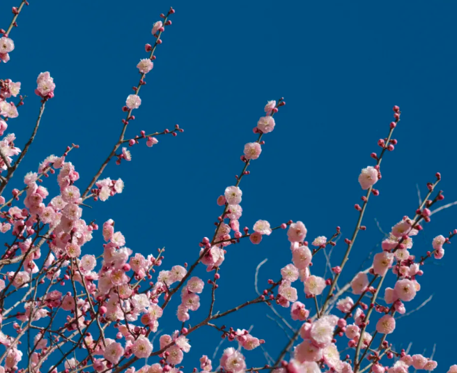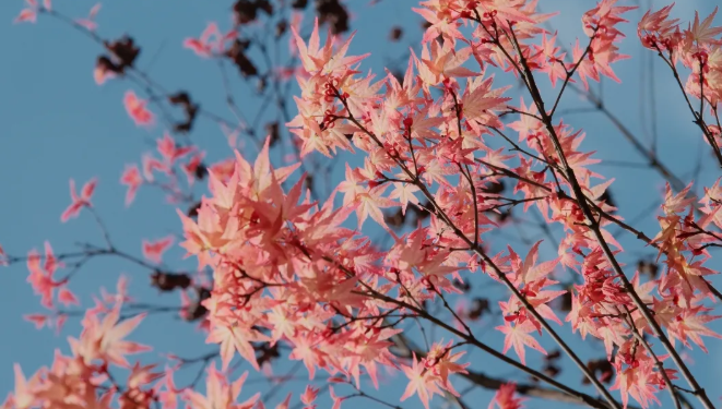 红枫鸡爪槭从浅粉到嫣红,从嫩红到浓艳,层层叠叠的色彩晕染在枝桠间,像被春日的阳光镀上了一层柔光,通透又明媚。