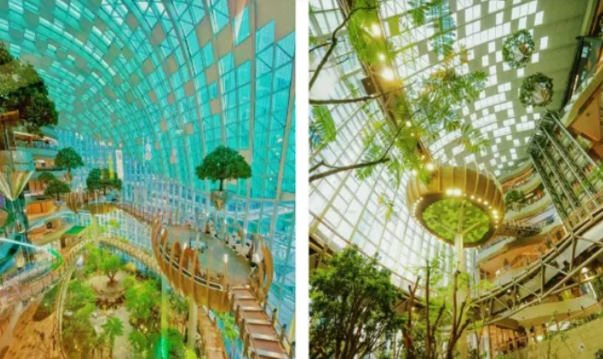 商场里藏了一座20米高的室内森林,300多种热带植物在机械脉络里野蛮生长,配合动态水幕和光影秀,简直像走进了科幻片。商场内部和廊桥随便逛不花钱,想进沐光森林区域的话提前在“光环”小程序约一下就行,即约即进。这种级别的沉浸式装置,放北上广怎么着也得卖票,重庆依然免费。