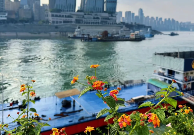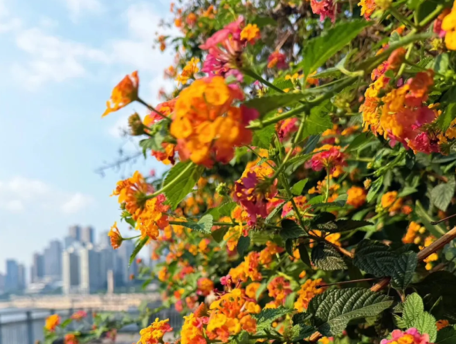 江边的护栏旁 马缨丹与月见草竞相绽放 凭栏眺望 绚丽夺目的小花与来福士 两江交汇风光 交相辉映