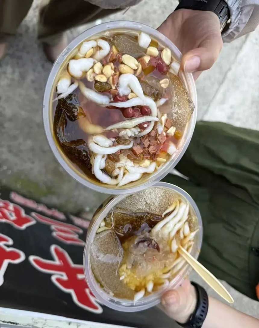:爬山累了,在“三岔口崖边花椒鸡”店的门口有一家手搓冰粉超级好吃,给料足,清甜爽口!