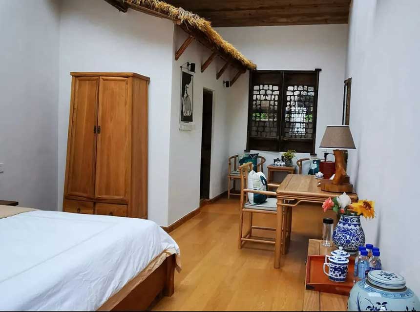 院子保留了巴县老民居的原始结构 青石板铺地 老木梁撑起屋顶 房间内没有过度设计 保留着淳朴的质感 但床品和卫浴 都选用了舒适的现代配置