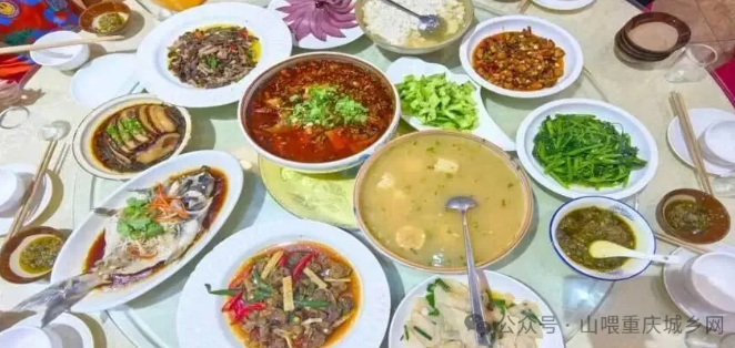 松山源山庄位于巴南区云篆山山上,空气格外清新,承接各种会议,宴席等,可垂钓,烧烤全羊,有三缺一娱乐,还可住宿,小菜都是农家菜自己种的,我们这次可是去吃刨猪汤,正宗的肥肠烧黄豆,烧白肥瘦适中,肥而不腻,后面那张图片就是刨猪汤,鲜嫩可口。