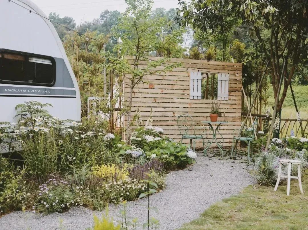 想要暂时告别都市的喧嚣吗? 美食、朋友、狗狗、阳光、草坪、秋千、篝火、帐篷、露天电影、星空,一样都不能少。 营地一共有6辆房车,每辆房车前面都有一个独立的小院。
