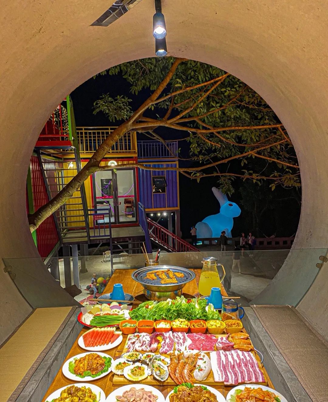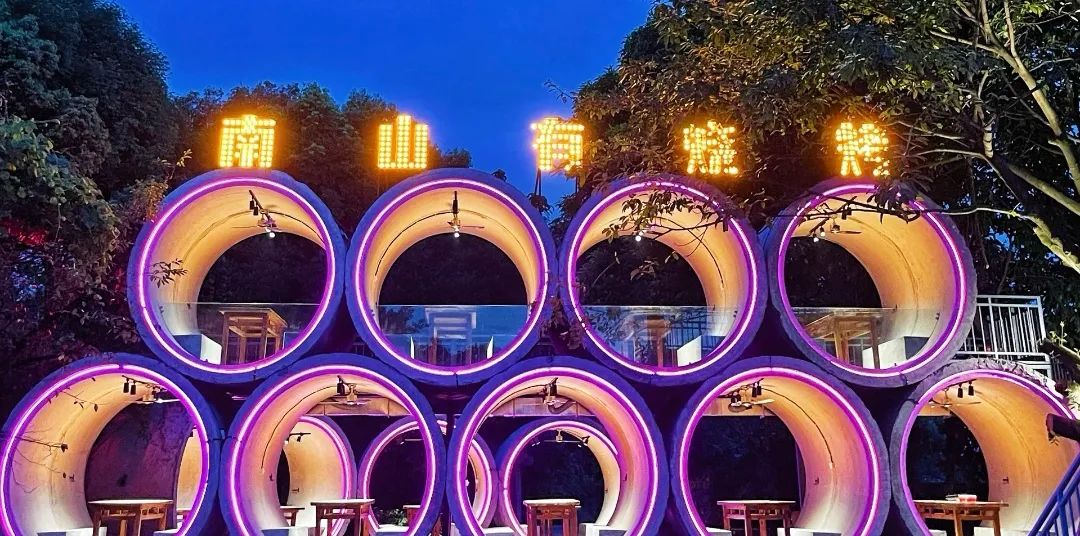 你知道坐在山顶的水泥大圆筒里吃烧烤是一种什么样的体验吗? 空气清新、风景绝美,氛围感拉满。 因为水泥大圆筒位子有限,所以需要提前预订。 分两个时间段用餐,17:00-19:00赏落日晚霞,19:30-21:30看华灯初上。