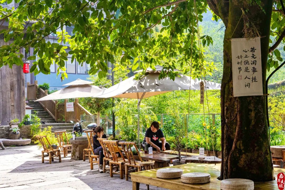 原木、竹椅、水泥墙面......色彩与质感的冷硬交织,让这里有种洒脱的随性。 高大的黄桷树在店前的坝子中投下浅浅荫凉,竹椅草席,石桌小花,挂着的秋千与故居前的三毛雕塑相呼应,时光在此溯回,小三毛在老屋前荡秋千、戏水缸的童年仿佛再次重现。