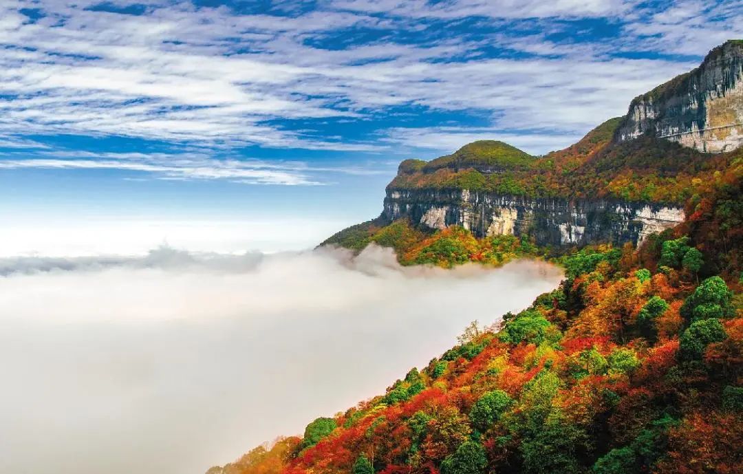 在重庆,金佛山可是离主城最近的可以欣赏彩林的地方。金佛山植被众多,林海茫茫,山上的红叶就有40多种。树木在不知不觉中就变了颜色,绿色、黄色、红色,处处都流落了“秋姑娘”的痕迹,山间五颜六色,色彩斑斓,犹如一幅秀美的画卷。