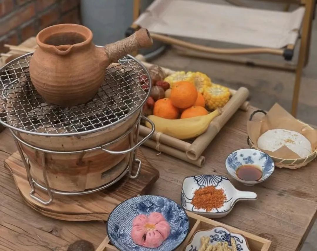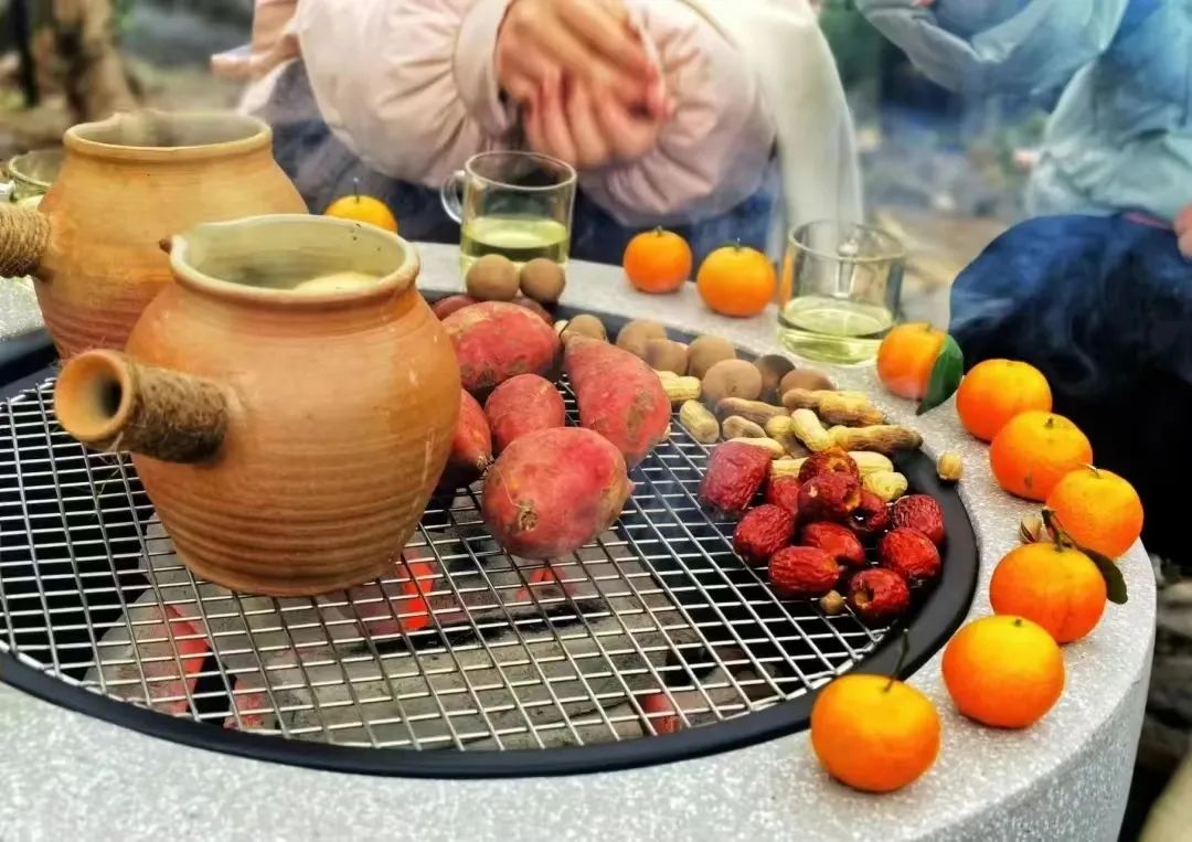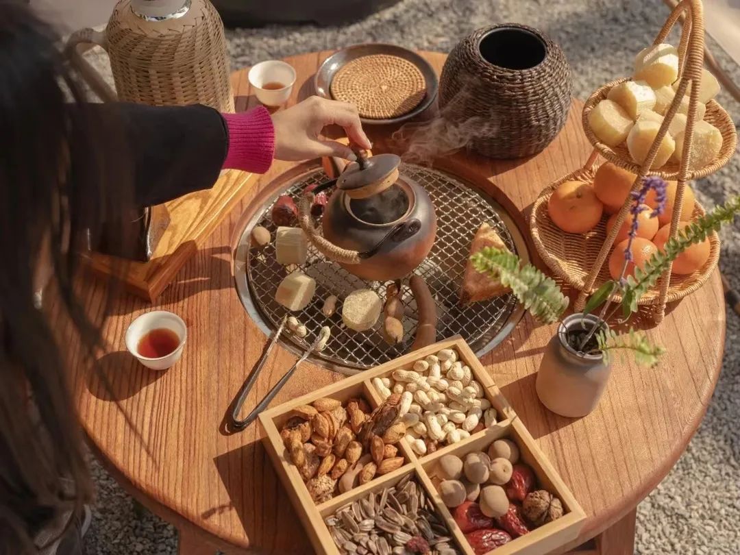 三五好友围桌而坐,架起炭炉、摆上茶壶,借着煮茶的炭火,顺便再烤上些柿子、红薯、花生、玉米等,伴着茶水翻滚的咕噜声,大家晒着太阳、喝茶说笑,不知不觉消磨半日时光……如此恬静、闲适的体验,很难不让人迷恋。