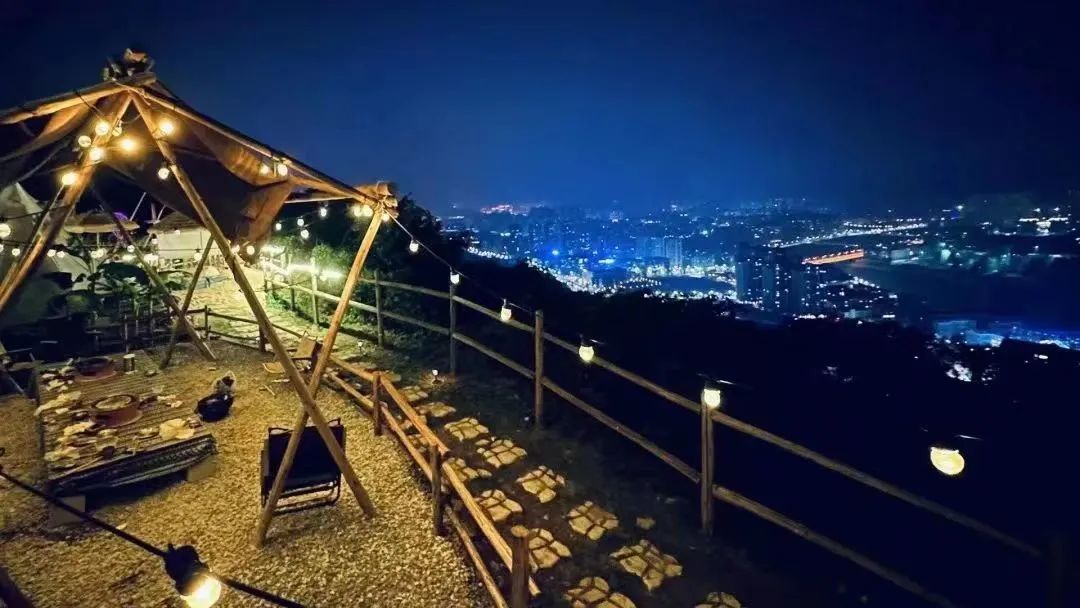 高空的夜景如一幅美丽的图画,灿烂的星星在天空中闪烁着,皎洁的月亮也在天空中努力地发光,玩累了,就来云篆山上的小院坐坐,喝点下午茶,吃点烤肉吧。