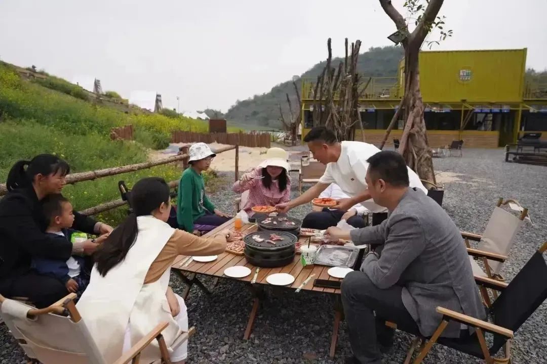 在营地,大大小小的各式帐篷在这里“安营扎寨”。记者注意到,众多市民游客都是有备而来,帐篷、地垫、桌椅、照明灯带等露营装备样样齐全。伴随着春日暖阳,大家在草地上席地而坐、在帐篷下与朋友闲谈,孩子们在草地上快乐奔跑,尽情挥洒汗水,释放满身活力;不少游客领取烧烤架和食材,在后山烧烤区域尽享美食带来的乐趣;还有的参与Go玩GO成长趣味运动课堂活动,孩子们在教练的带领下,扔飞盘、踢足球、走迷宫、玩攻防箭。