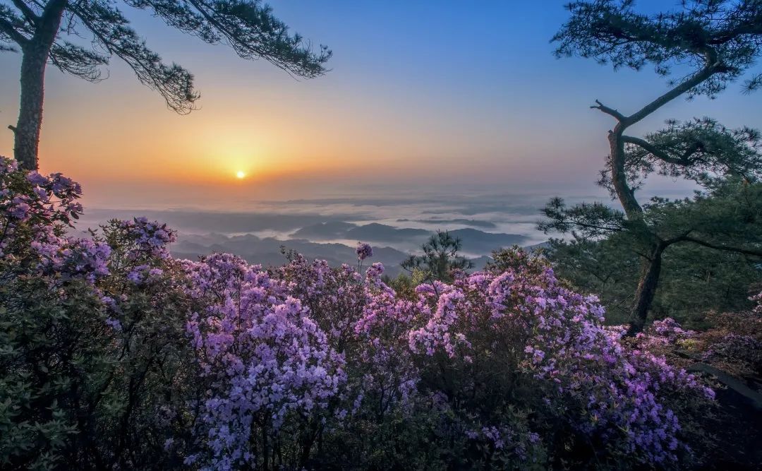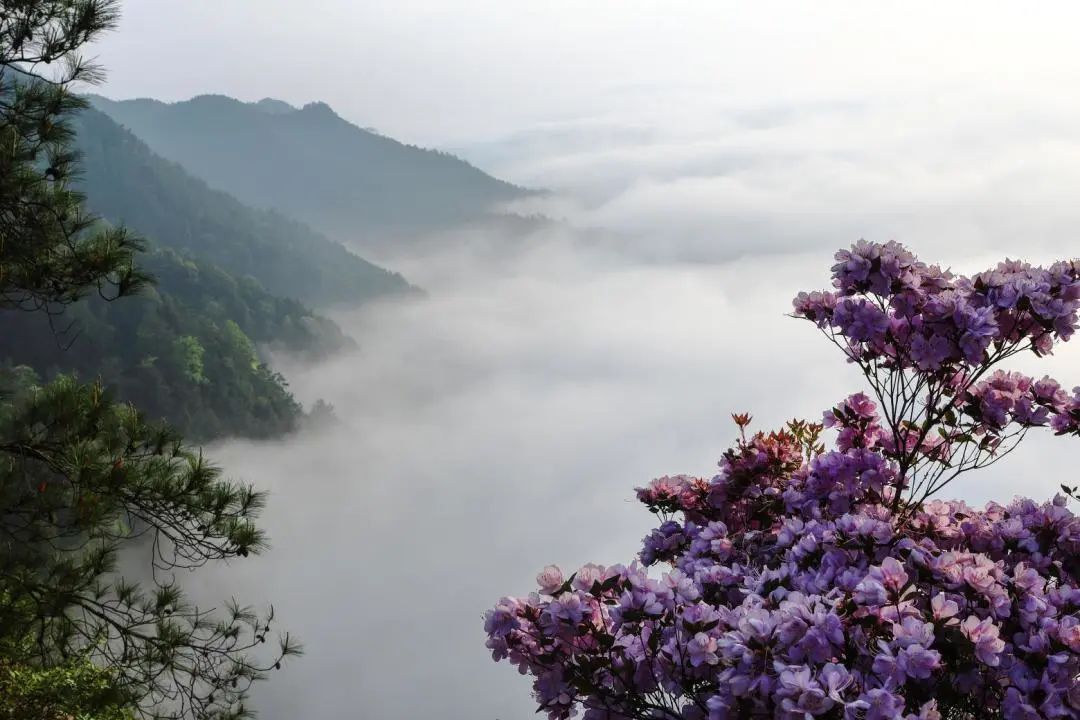 紫杜鹃生长在宝鼎山海拔六、七百米以上山的两侧宽度几公里,总面积近万亩