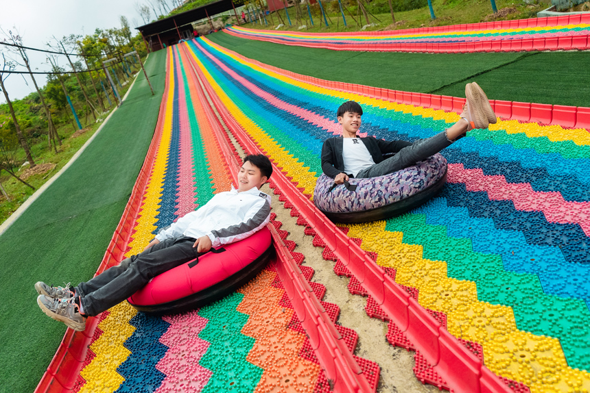 就是这种快速滑动,并且高低起伏的感觉非常棒。在滑动的过程中,可以感受到自己的心跳加速,就好像跟着滑道一起飞奔。在彩虹滑道上还可以欣赏周边美景,就好像是画面从眼前快速播放。
