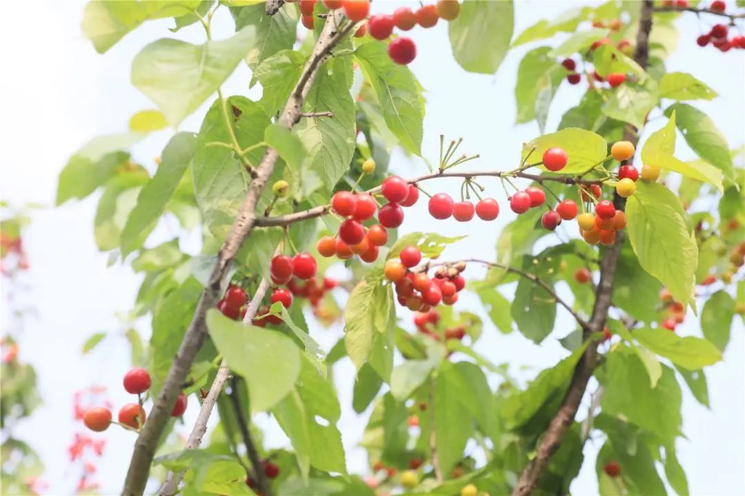 樱桃园依山势种植 越往上走 樱桃越红 沿途还可以樱桃树的美景 青翠欲滴的樱桃树长势正旺 拨开嫩绿色的树叶 就露出了一串串玲珑剔透、淡红或大红的樱桃