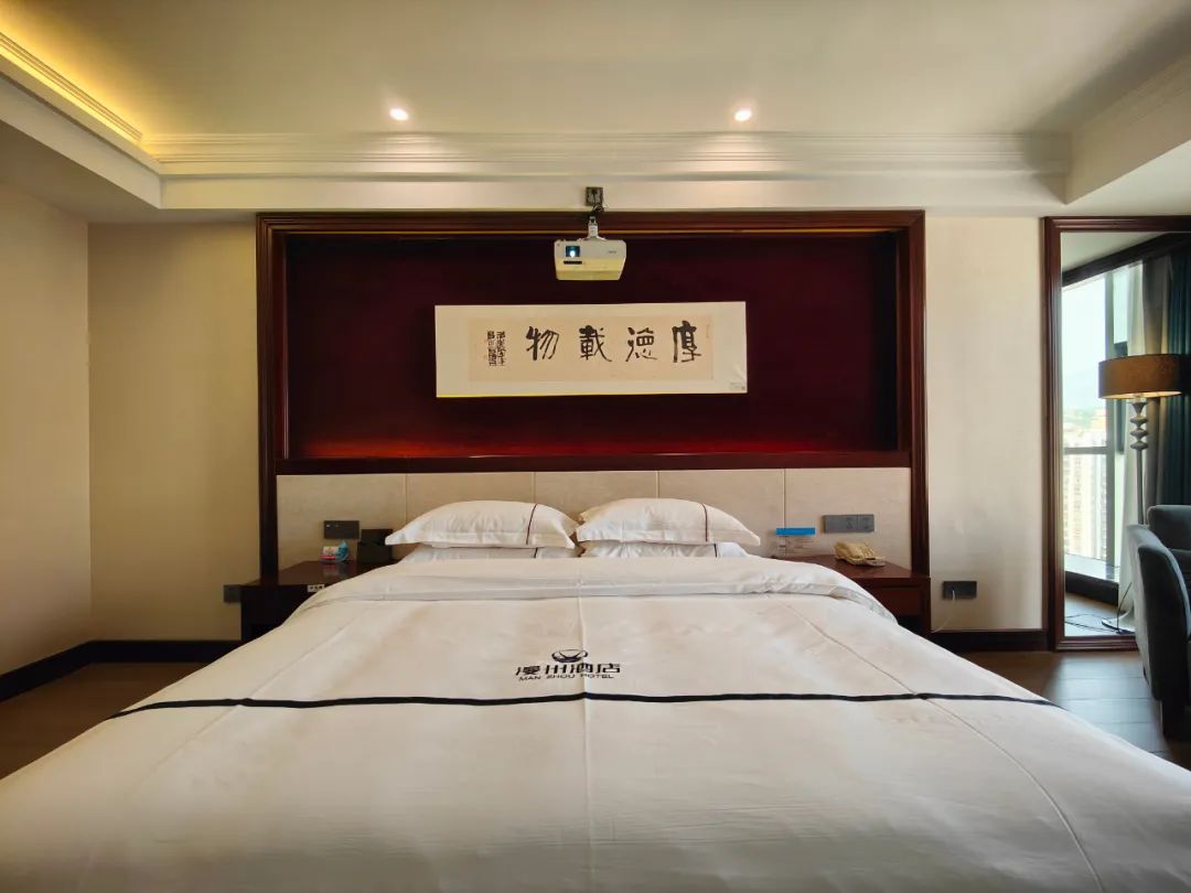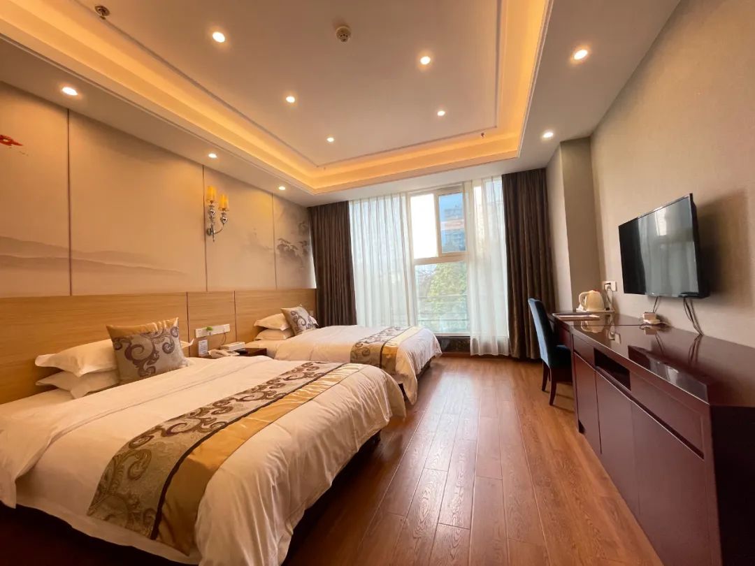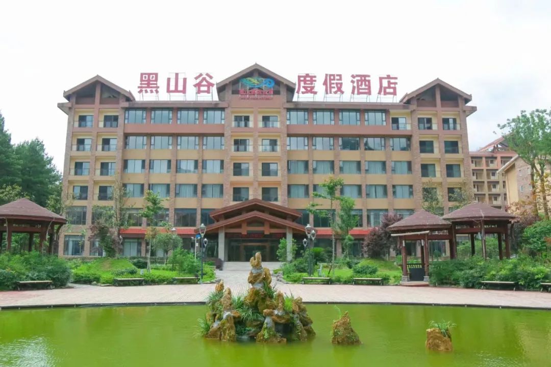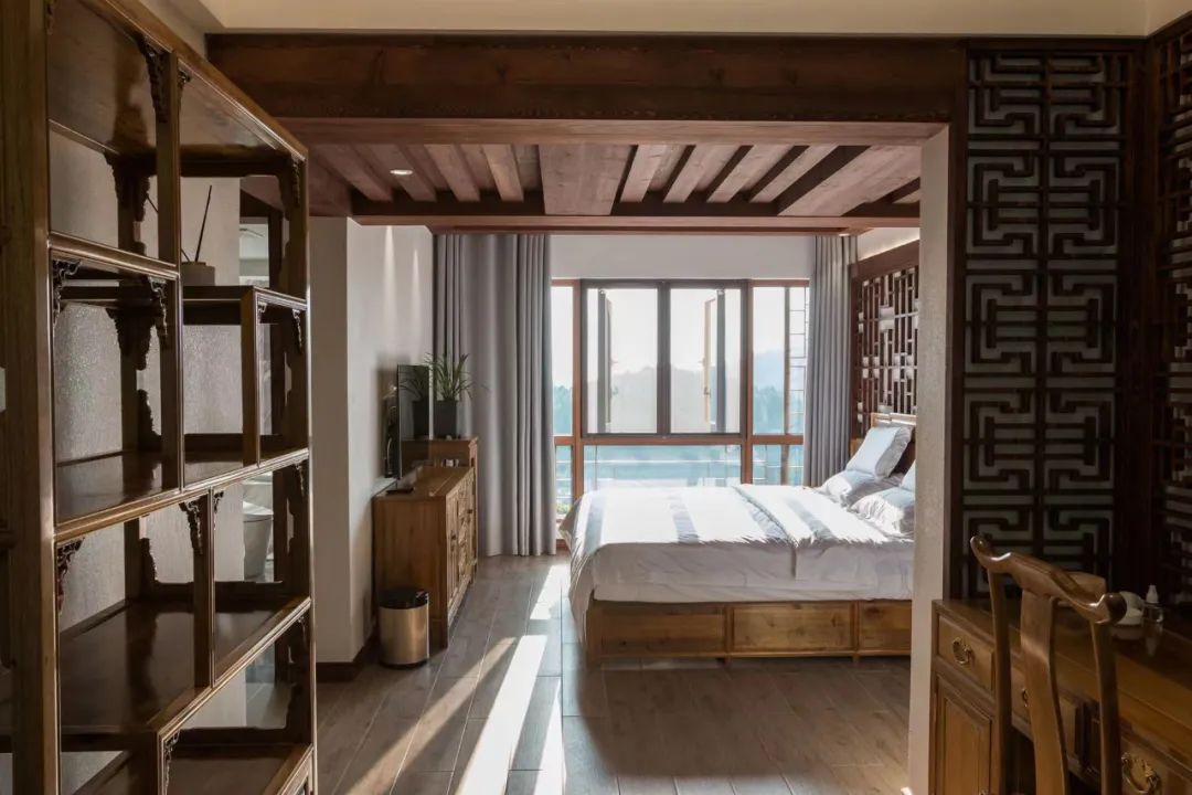 酒店坐落于黑山谷景区入口群山环绕,绿意成荫酒店采用纯手工定制楠木家具新中式装修园林式打造