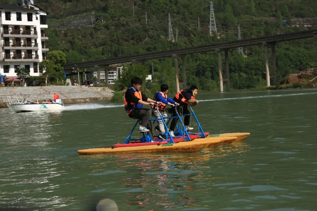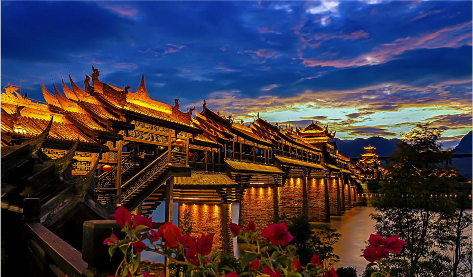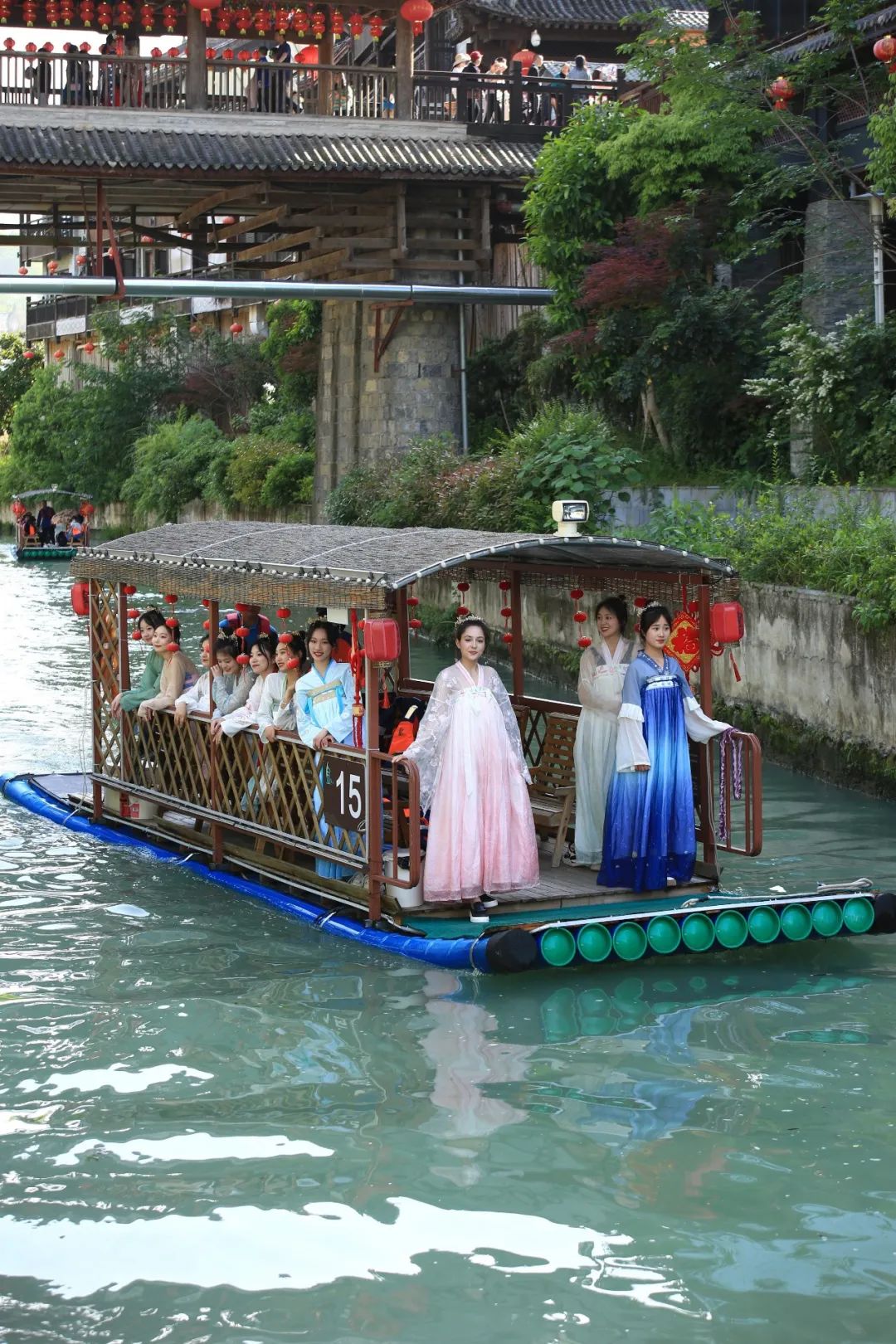 当然不能错过的就是我们远近闻名的世界第一风雨廊桥啦,你看这夜景,你就说炫不炫。还有竹筏、水上自行车等项目,穿着汉服乘船游于古镇旁,恍然真的穿越到古代。
