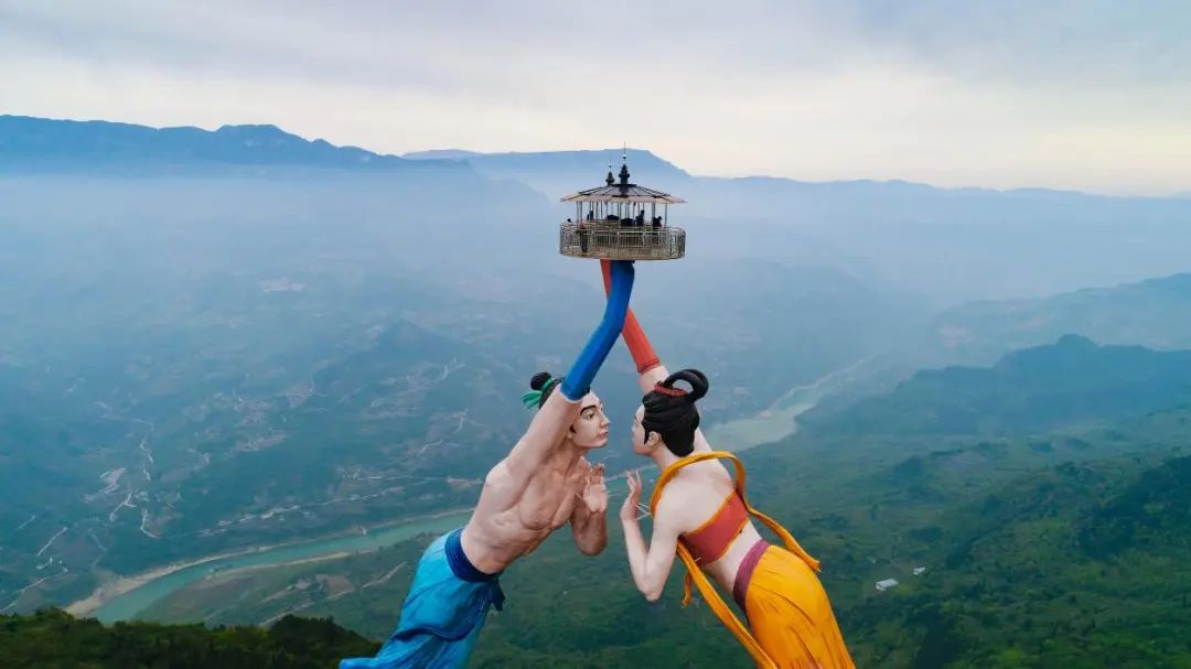 和朋友登上飞天之吻站在由仙女、王子托举着的小亭里鸟瞰整个景区旖旎迷人风光