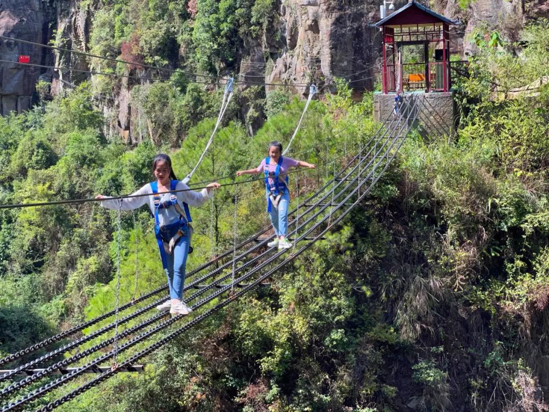 在武隆呐溪原乡与大自然邂逅放松心情的同时还可以来一场对身体的试炼景区的飞拉达、飞跃丛林、铁索桥高空速滑、攀岩等16个户外项目体验从黎明到黄昏的刺激旅程.