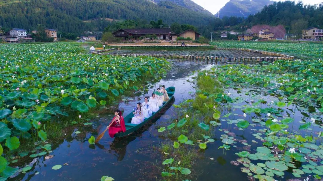 划柳叶舟、画舫船在湖内穿行看藻丛游鱼戏逐享古寨原生态生活玩水上游乐竞技的乐趣.