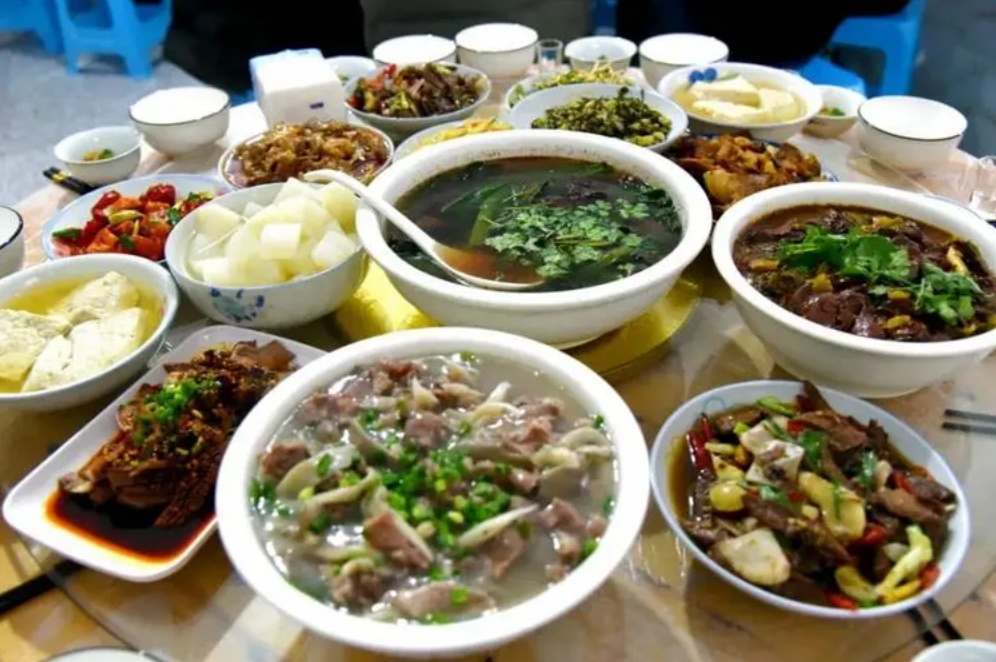 刨猪汤”很有讲究,要求七大碗八大碟,主菜一般都有粉蒸肉、回锅肉、肝腰合炒、泡椒血旺,大骨萝卜汤等,那一盆地地道道的“刨猪汤”更是吃刨猪汤的灵魂所在。