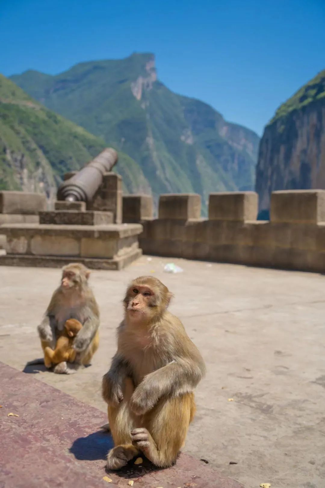 这次我们选择赤甲6号深度游瞿塘峡,从夔门印象出发,沿江而上,观两岸之景,然后再下船攀登一小段山路,到达赤甲楼古炮台,赤甲楼依山而建,现如今已成猕猴的乐园,猴群在城墙以及古炮台来回踱步、上蹿下跳,背后就是三峡之巅,这样的景观实在是震撼人心。