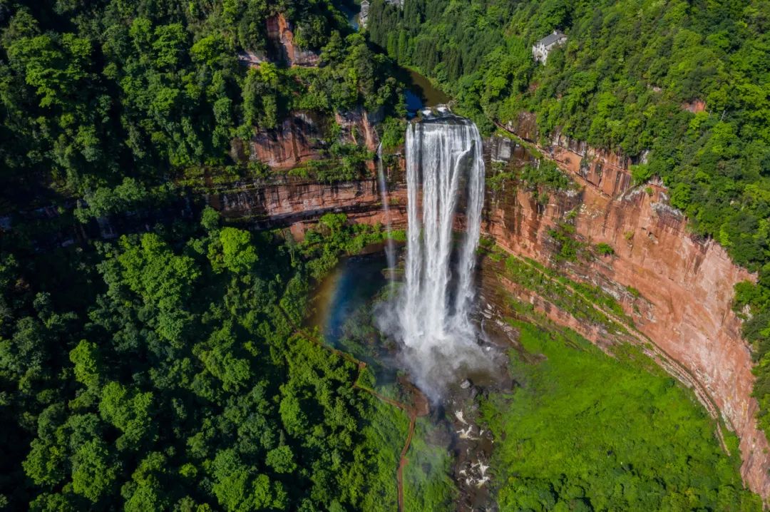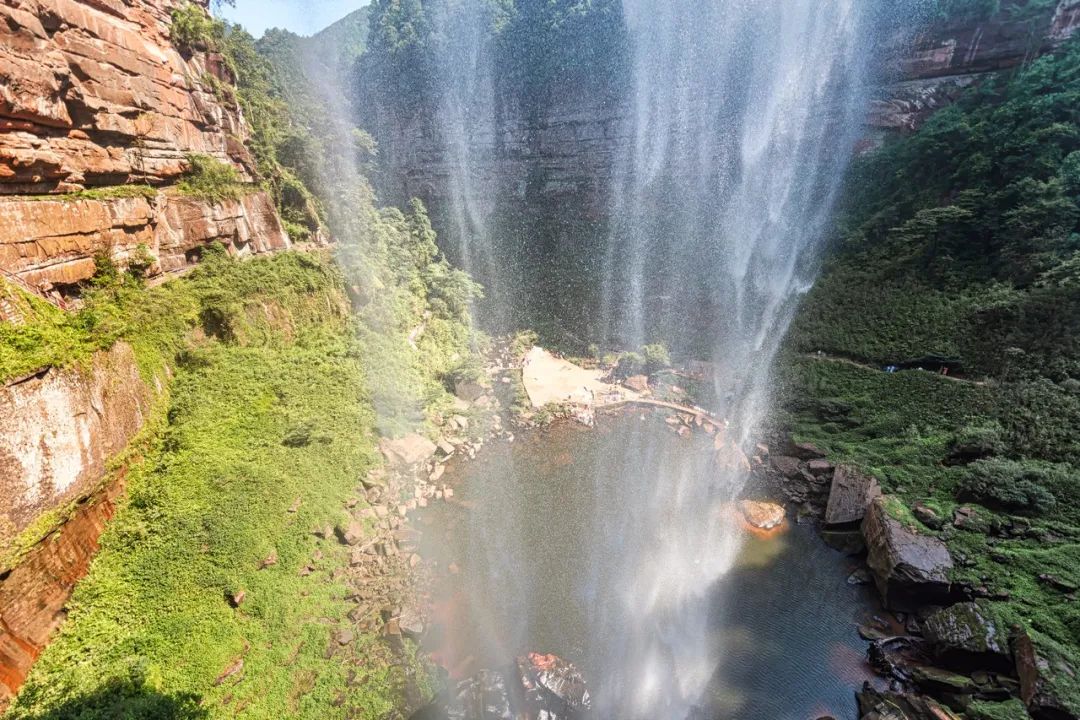 水口寺景区融合了瀑布、丹霞地貌、森林、峡谷、深潭、彩虹等多种景观。