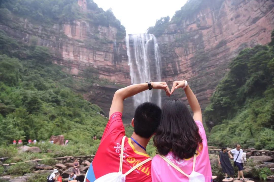 一是站在瀑布下,倾听奔流而下的浩荡水声,与“华夏第一高瀑”来张亲密的合影;