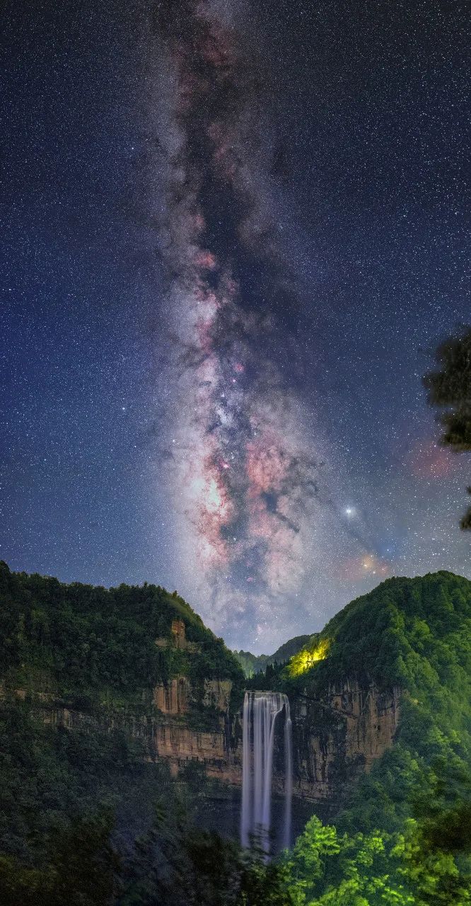 到了夜晚,还可以在望乡台瀑布观赏“飞流直下三千尺,疑是银河落九天”的壮丽奇景,繁星点缀天空,瀑布垂直而下。