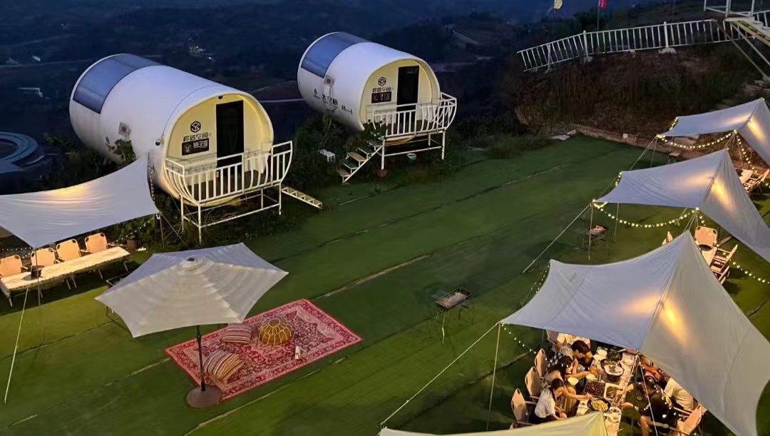一半是榻榻米的日式茶席,一半 是长木桌椅的餐位,落地窗印衬 着山谷间翻滚的云海使茶室自带 仙气。山居的早餐基本上以五谷 杂粮为主,晚餐则是主打农家菜。 来云山居当然少不了喝茶。除了 在房间、小客厅可以品茶,下午 也可以在茶室喝下午茶,中式点 心配上香茶与美景,云端茶室, 与光同尘。天坪山露营基地电话:17323964384