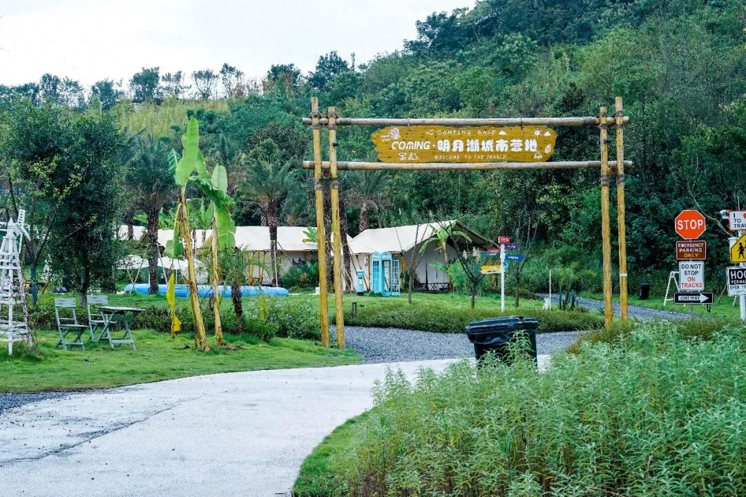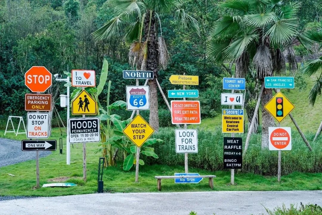 在这个营地,拍照也很出片,各种草屋、指示牌被草丛和树木包围着,感觉像在三亚度假。