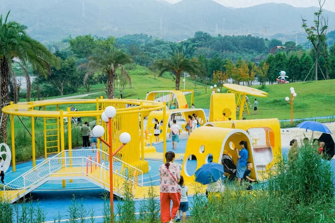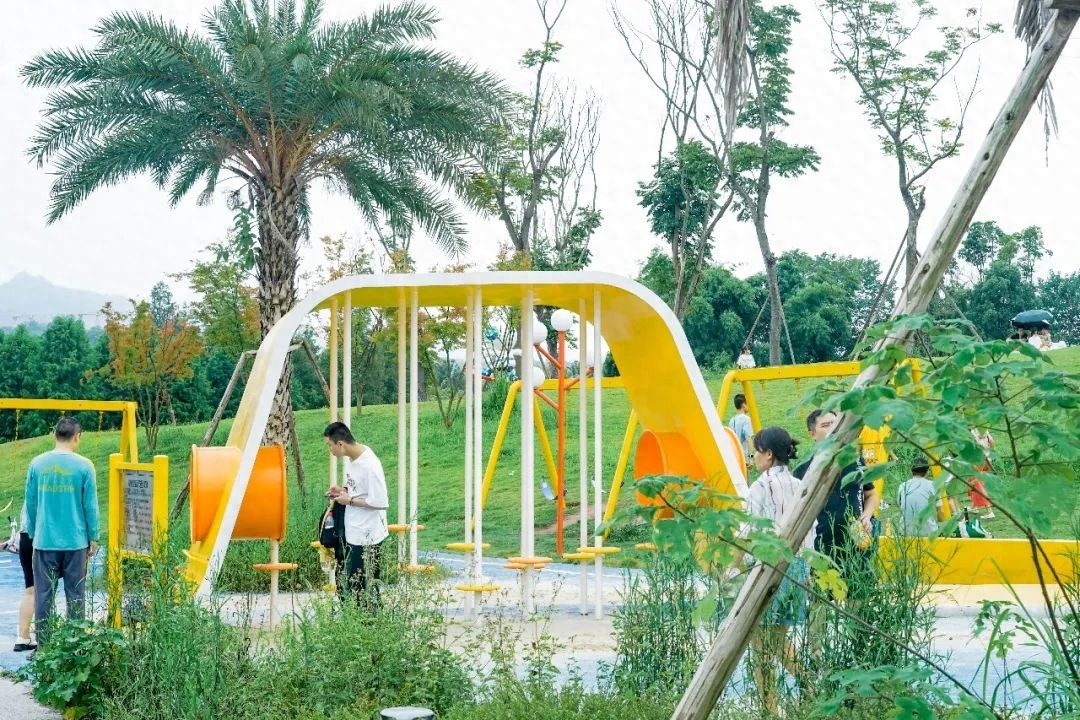 攀爬架和设施都比较新,旁边还有洗手池,耍完也能干干净净的。除了游乐设施,还有皮划艇可以耍,换个角度观赏明月湖也很棒呀。
