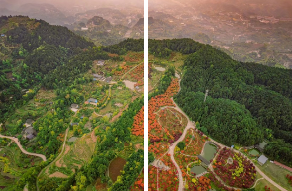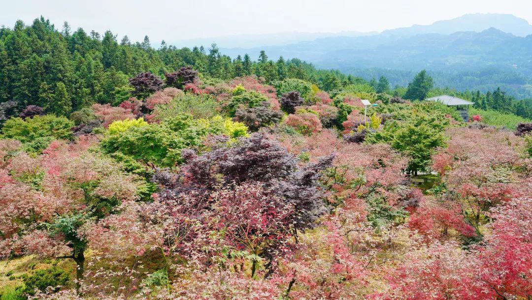 园区占地1028余亩,种植了红枫、樱花、紫荆、桂花、石榴等各类苗木,并建造了长廊、楼阁、庭院、小桥、流水等园林景观,有色植物与仿古建筑高低错落有致,形成四季分明、规模庞大的园林景观,已成为巴南乡村休闲生态旅游的品牌项目之一,主城区最具特色的春季红枫观赏地之一。