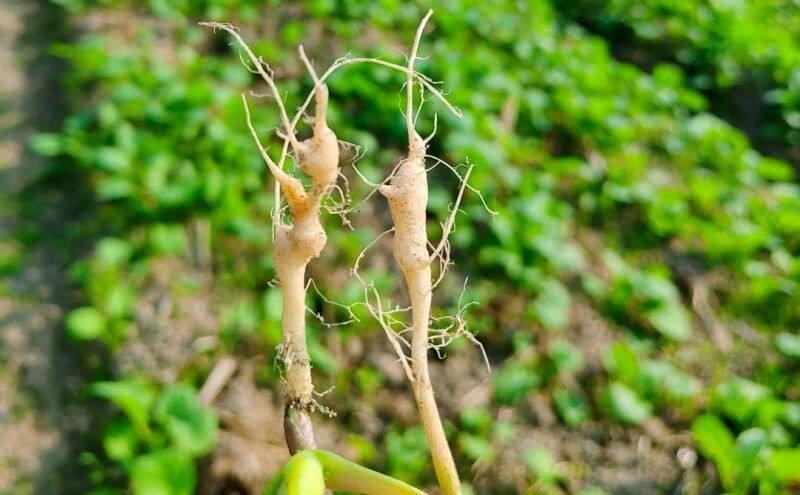 油菜苗期开始显现病害,病菌侵入植株根部,形成肿瘤。肿瘤初期小而光滑,随病情发展变大变色,最终龟裂。