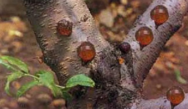 春夏季在当年新梢上以皮孔为中心,发生大小不等的某些突起的病斑,以后流出无色半透明的软树胶;在其他枝干的伤口处或1-2年生的芽痕附近,也会流出半透明的树胶,以后树胶变成茶褐色的结晶体,吸水后膨胀,呈胨状胶体,严重时树皮开裂,枝干枯死,树体衰弱。原因有几种:1、细菌性;2、蛀干害虫、椿象等造成伤口;3、碰、冻、晒伤;4、环境如土壤粘重、酸性大、积水等。防治方法:将病部刮除干净后,伤口涂45%石硫合剂30倍液或市面上售卖的一些膏剂。