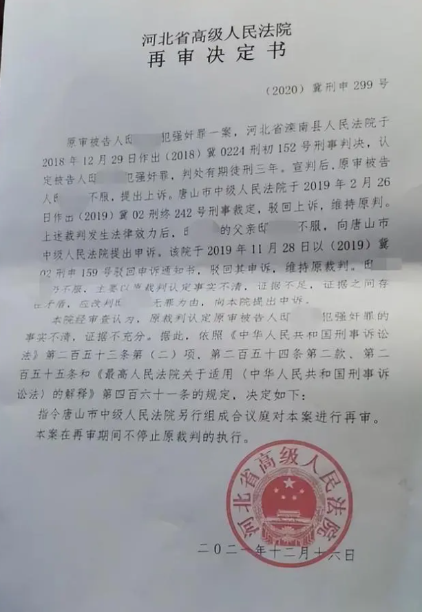 河北省高院审查认为,原裁判认定原审被告人邸某犯强奸罪的事实不清,证据不充分。2021年12月16日,河北省高院决定:指令唐山市中院另行组成合议庭对此案进行再审。