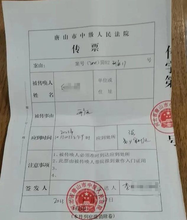 2023年9月下旬,小邸家人收到了唐山中院的传票,通知他们10月10日到唐山中院参加开庭。