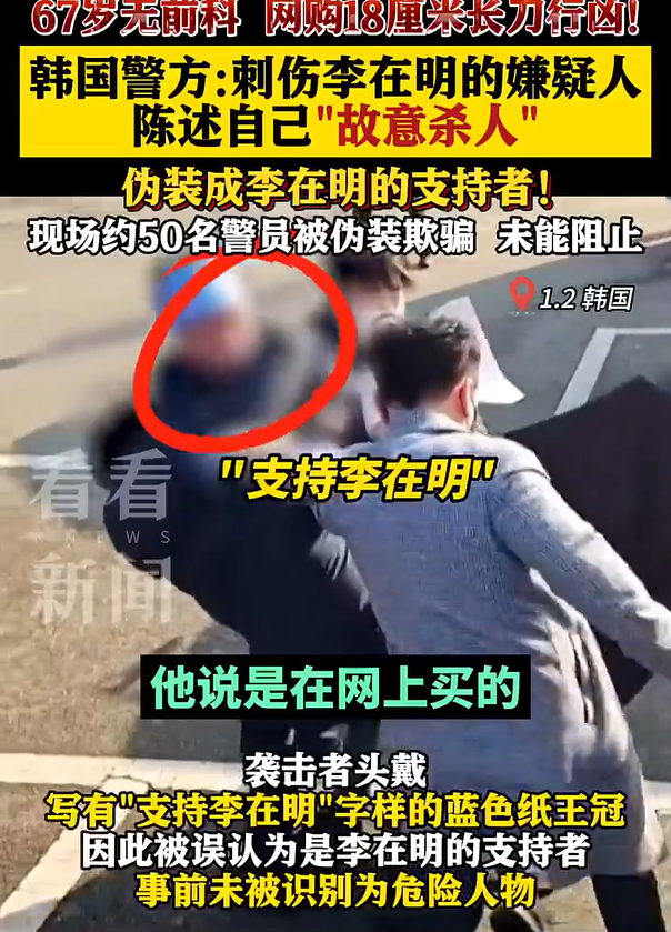 韩国釜山地方警察厅调查本部1月2日下午举行记者会,介绍了最大在野党党首李在明遇袭事件的初步调查结果。警方经确认,在釜山用凶器袭击李在明的是一名1957年出生的男性,居住地在忠清南道,2023年在网上购买了袭击时使用的18厘米长的刀具。