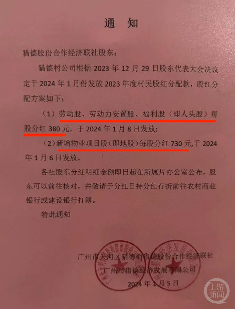 网传方案称,“猎德村公司根据 2023年12月29日股东代表大会决议,定于2024年1月份发放2023年度村民股红分配款,股红分配方案如下:(1)劳动股、劳动力安置股、福利股(即人头股)每股分红380元,于2024年1月8日发放;(2)新增物业项目股(即地股)每股分红730元,于2024年1月6日发放。各社股东分红明细金额即日起在所属片办公室公布,股东可以前往核对,并敬请于分红日持分红存折前往银行打簿。”