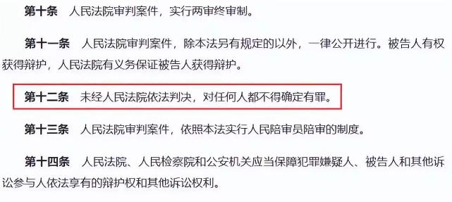 《刑事诉讼法》第12条规定,任何人未经人民法院判决,不得认定为有罪。