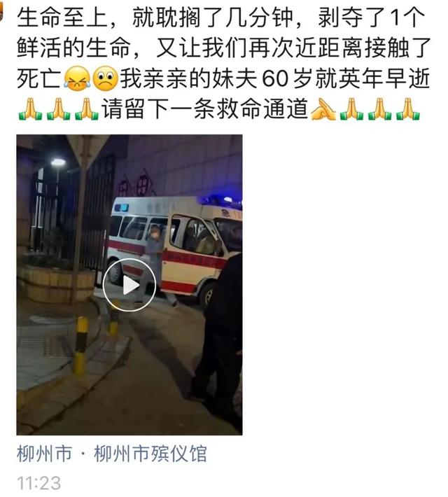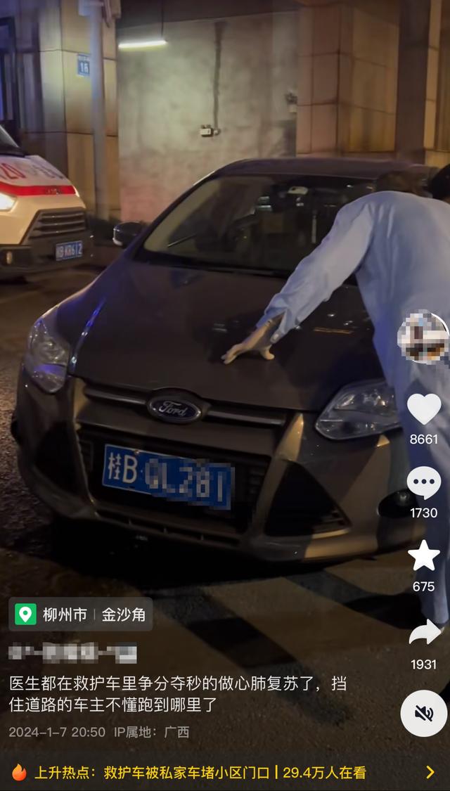 1月7日晚9点左右,广西柳州一网民发布视频,疑似一救护车辆在柳州金沙角小区接诊急救病人送往医院时,因一私家车辆停放在门口而被堵住无法离开。1月9日有消息称,120急救车上的患者疑似去世。